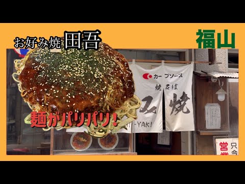 こんにちは、快適食堂です。 今回は、JR福山駅から南に徒歩2分の所にあるプチ繁華街の中のお好み焼き田吾さんです。